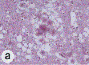 πάσχοντος από παραλλαγμένη νόσο Creutzfeldt-Jacob (vCJD). (a) Χρώση PAS: Σχηματισμένες πλάκες που